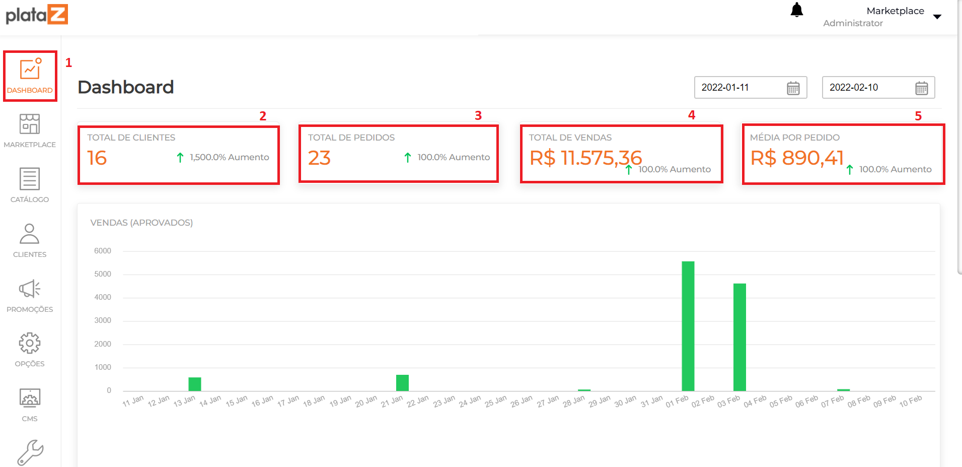 O Dashboard conta com diversos campos que trazem informações do desempenho do seu Marketplace. Cada um deles contempla uma origem de dados.