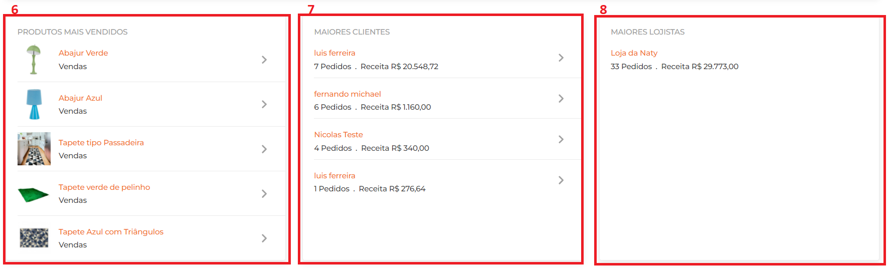 Maiores Clientes: Neste bloco, você verá os consumidores que mais compraram em seu Marketplace. Clicando no nome de um consumidor, você poderá visualizar todos os detalhes de suas compras.