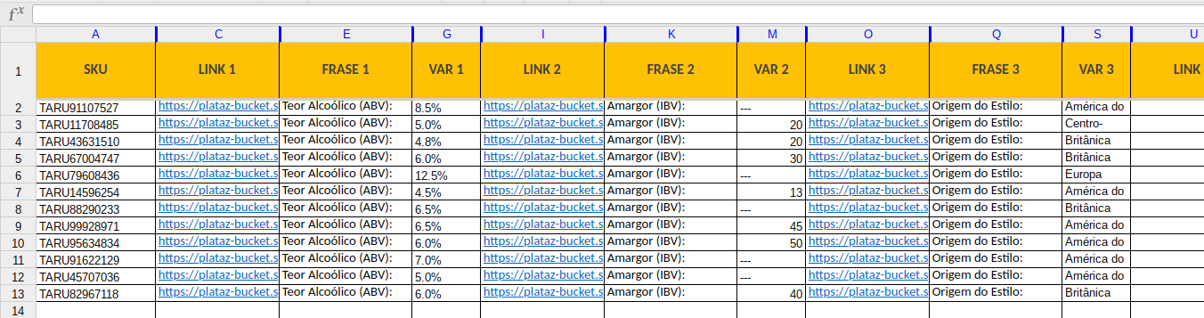 Para facilitar este processo de criação, criamos uma planilha onde será possível inserir até 5 frases, com link das imagens, frases específicas e uma variação destas frases, conforme mostra imagem acima.