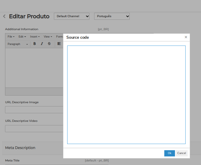 Para inserir o HTML, clique em “<>”, será aberto o seguinte campo: