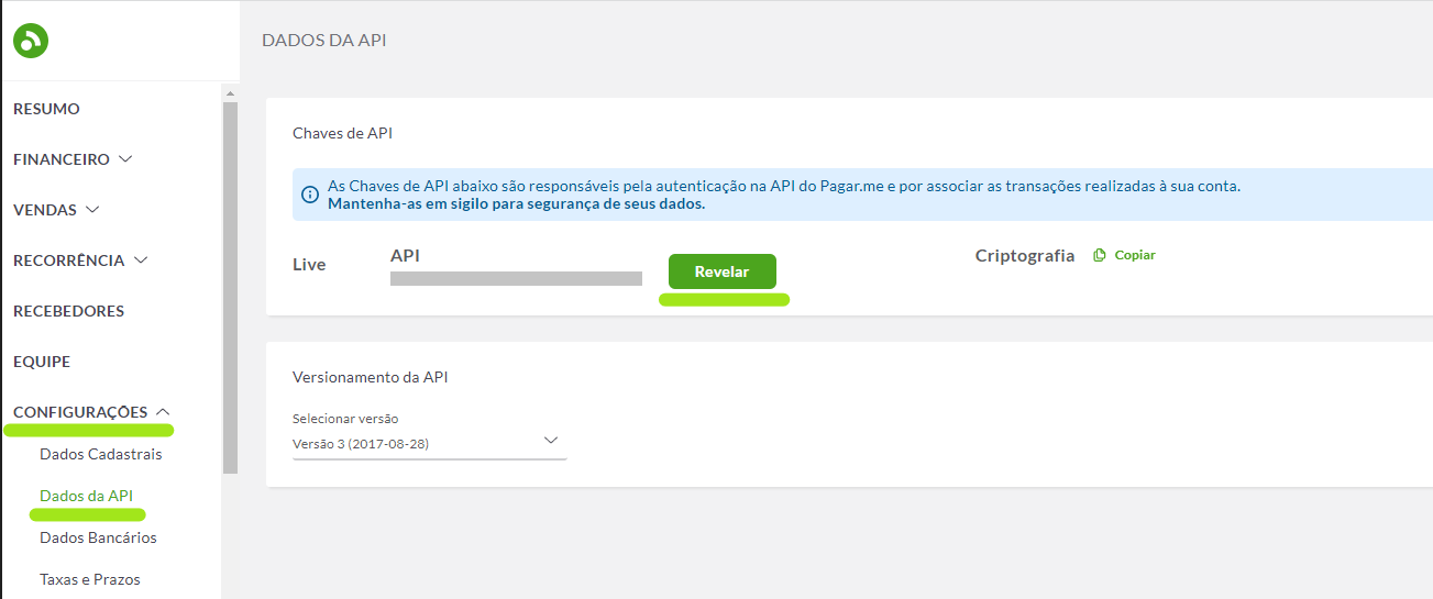 Feito isso, você deve entrar na conta do Pagar.me e seguir o passo a passo: Configurações>Dados da API