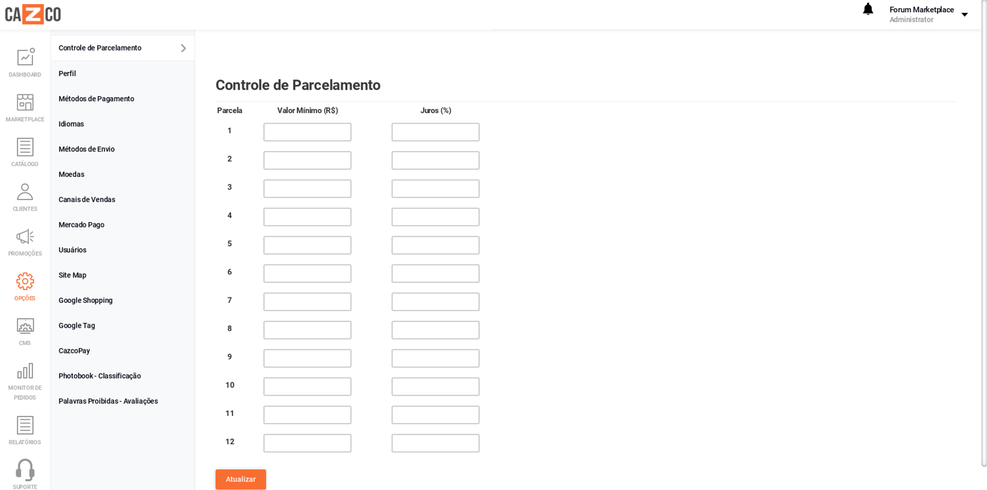 No Admin, vá até a aba "Opções" e selecione "Controle de Parcelamento".