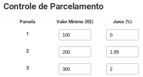 Juros: Representa a porcentagem de juros (por exemplo, 1.99) adicionada a cada parcela. Se desejar oferecer parcelamento sem juros, basta inserir 0.