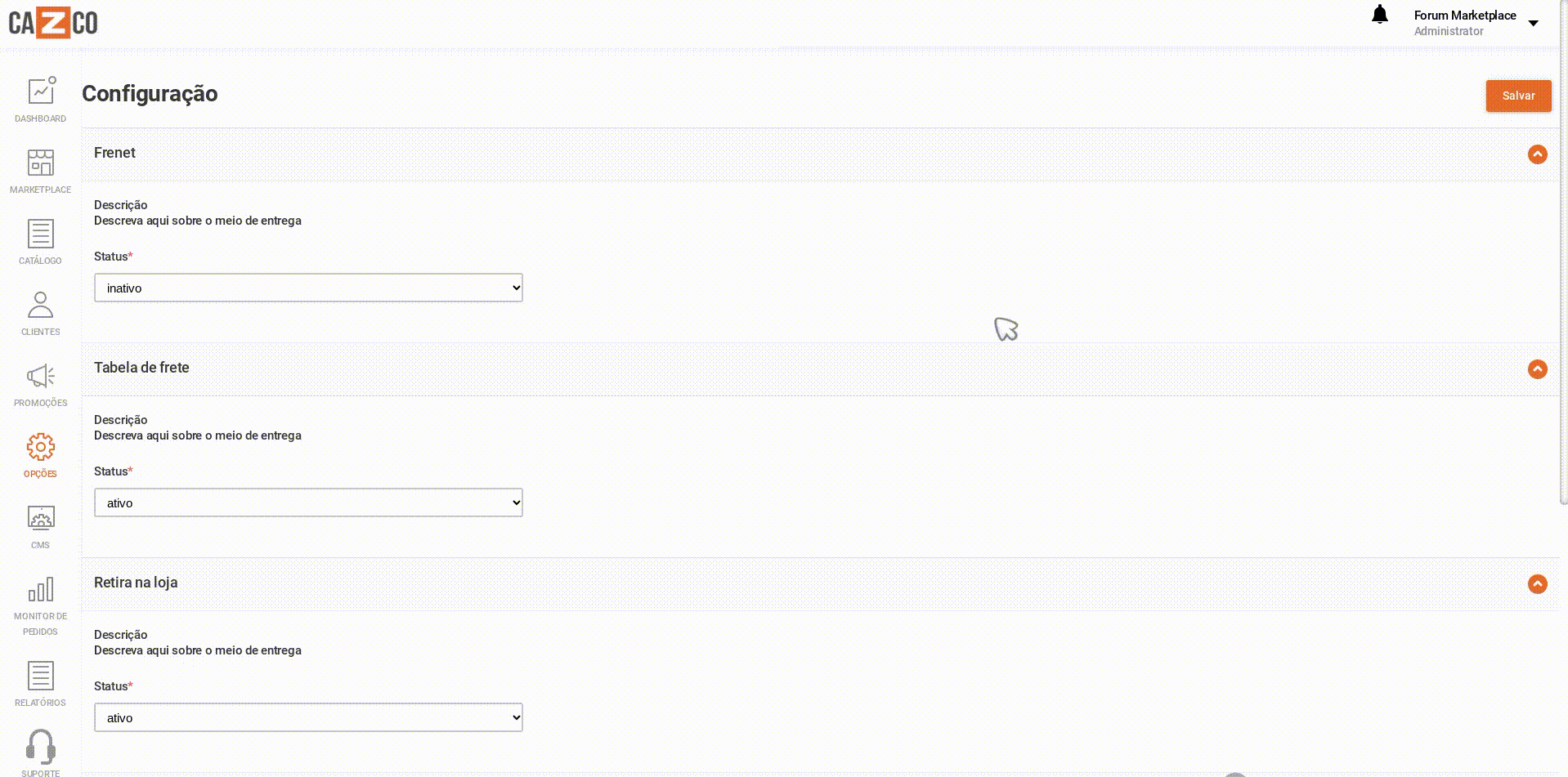 Nesta página, você pode gerenciar quais métodos de envio estarão disponíveis para os lojistas, permitindo que eles ativem ou desativem as opções conforme necessário.